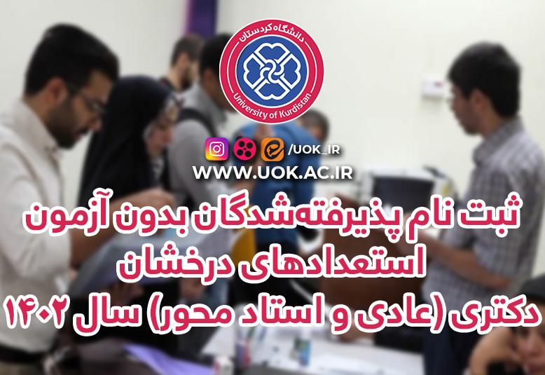 اطلاعیه ثبت نام پذیرفتهشدگان بدون آزمون استعدادهای درخشان دکتری (عادی و استاد محور) سال 1402 در دانشگاه کردستان